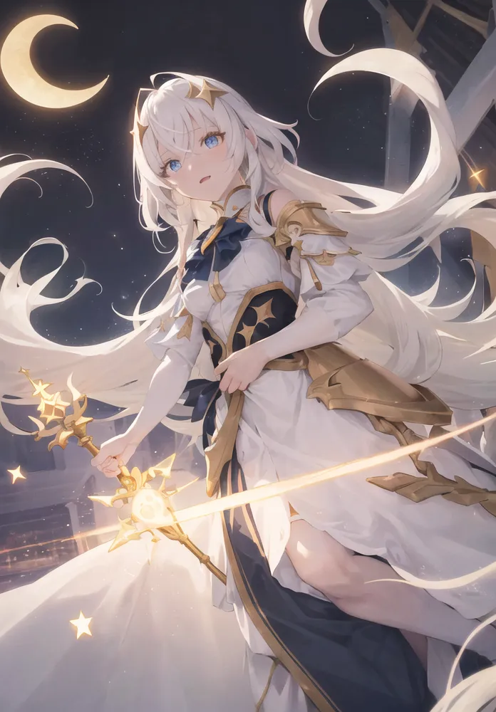 #majinai #Generate #an #image #of #a #woman #with #long #flowing #hair #that #radiates #a #bright #white #light #She #wears #a #flowing #gown #made #of #shimmering #fabric #that #resembles #stars #in #the #night #sky #Her #eyes #are #a #piercing #shade #of #blue #that #sparkles #like #diamonds #She #stands #on #a #platform #made #of #clouds #surrounded #by #an #aura #of #warm #golden #light #that #seems #to #emanate #from #her #very #being #In #her #hand #she #holds #a #glowing #staff #that #illuminates #the #darkness #around #her #The #background #is #a #celestial #sky #filled #with #stars #and #a #crescent #moon