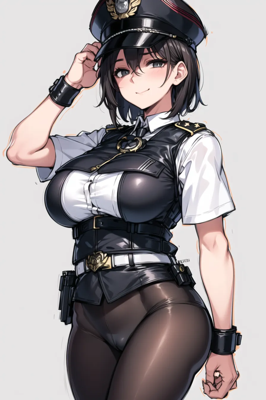 #majinai #realistic #mature #woman #slender #tights #handcuffs #peaked #cap #police #officer #simple #white #background #short #sleeve #soft #smile #bulletproof #vest