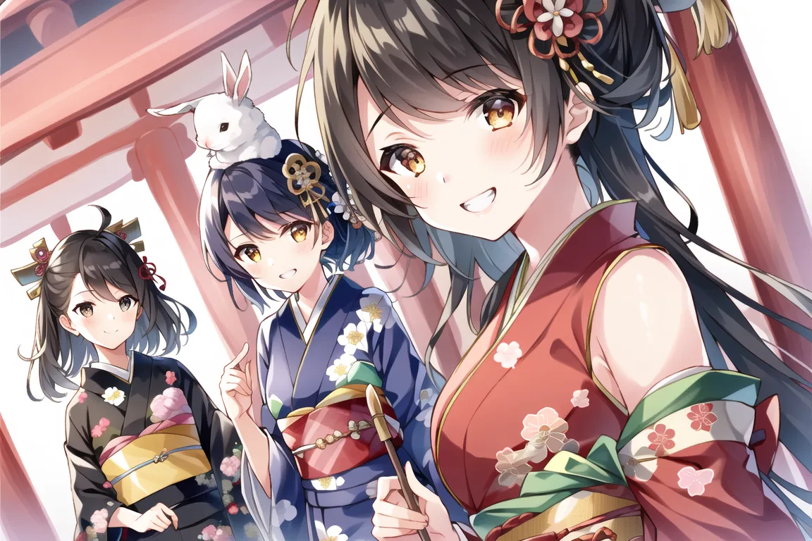 #majinai #4girls #standing #V #rabbit #on #head #many #rabbits #angora #rabbits #animal #smile :D #embroidery #multi #color #kimono #japanese #clothes #beautiful #intricate #happy #new #year #Shinto #shrine #grin #Black #long #hair #hair #ornament #hair #flower #Black #long #hair #with #side #ponytail #short #hair #medium #hair #disheveled #hair #ahoge #small #breasts #dot #nose #side #blunt #bangs #hairs #between #eyes #side #lighting #perfect #lighting #light #leak #dynamic #angle #very #wide #shot .2 #extremely #detailed #CG #8k #wallpaper #masterpiece