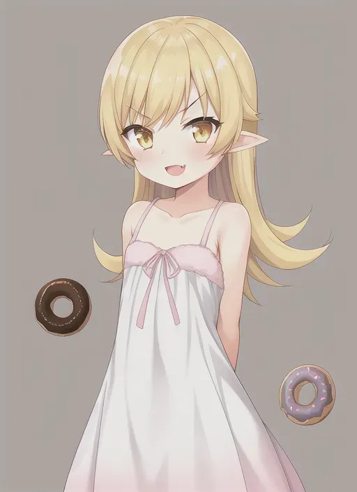 #majinai #1girl #oshino #shinobu #arms #behind #back #bare #arms #bare #shoulders #blonde #hair #closed #mouth #collarbone #dress #eyebrows #visible #through #hair #female #child #flat #chest #loli #monogatari #series #watanabe #akio #gradient #gradient #background #grey #background #long #hair #looking #at #viewer #pink #background #shadow #sidelocks #simple #background #sleeveless #sleeveless #dress #solo #standing #two-tone #background #v-shaped #eyebrows #white #dress #yellow #eyes [[[elf]]] :D #fang #donuts
