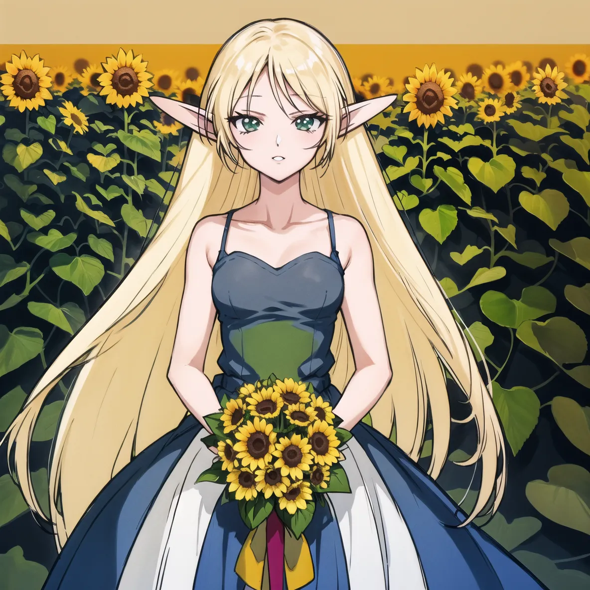 #majinai #Deedlit #retro #anime #style #best #quality #ultra-detailed #shoujo #manga #art #style #Illustration #sketch #watercolor #effect #1girl #elf #girl #pointy #ears #bare #arms #blue #ribbon #bouquet #bow #collarbone #dress #flower #grey #dress #holding #holding #bouquet #long #dress #blonde #long #hair #looking #at #viewer #ribbon #sleeveless #sleeveless #dress #solo #standing #straight #hair #sundress #sunflower #very #long #hair #green #eyes #yellow #flower
