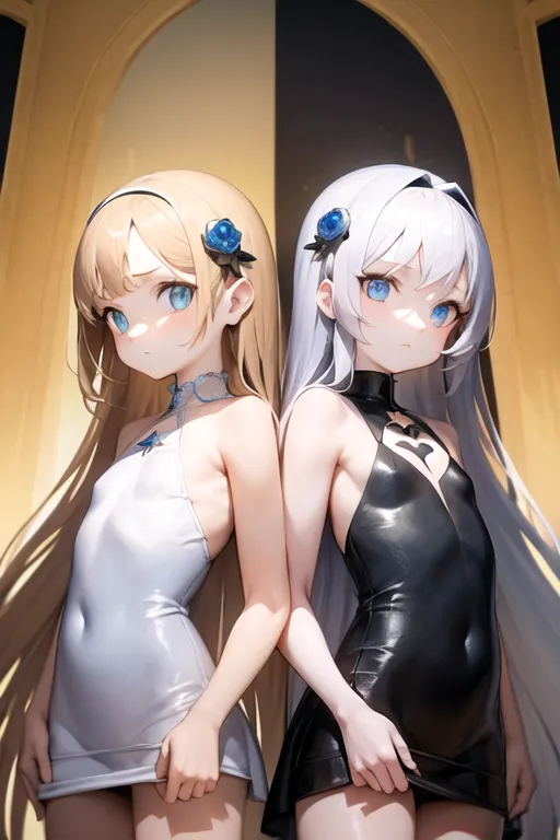 #majinai #masterpiece #best #quality #2girls #back #to #back #age #down #loli #cute #little #girl #Child #body #flat #chest #little #twin #girls #with #contrasting #black #and #white #motifs #girl #A #with #white #motif #symbolizing #purity #girl #B #with #black #motif #representing #mystique #and #power #strong #magical #abilities #despite #youthful #appearance #determined #and #powerful #poses #as #guardians #of #the #divine #realmmysterious #accessories #and #decorations #on #their #outfits #magical #effects #and #glowing #light #surrounding #them #rim #lighting #side #lighting #cinematic #light #ultra #high #res #8k #uhd #film #grain #best #shadow #delicate #RAW #hyper #realistic #lifelike #3d #detailed #skin #texture #detailed #cloth #texture #beautiful #detailed #face #intricate #details #ultra #detailed #BREAK #fantastical #and #majestic #divine #realm #background #light #and #shadow #interplay #masterpiece #best #quality