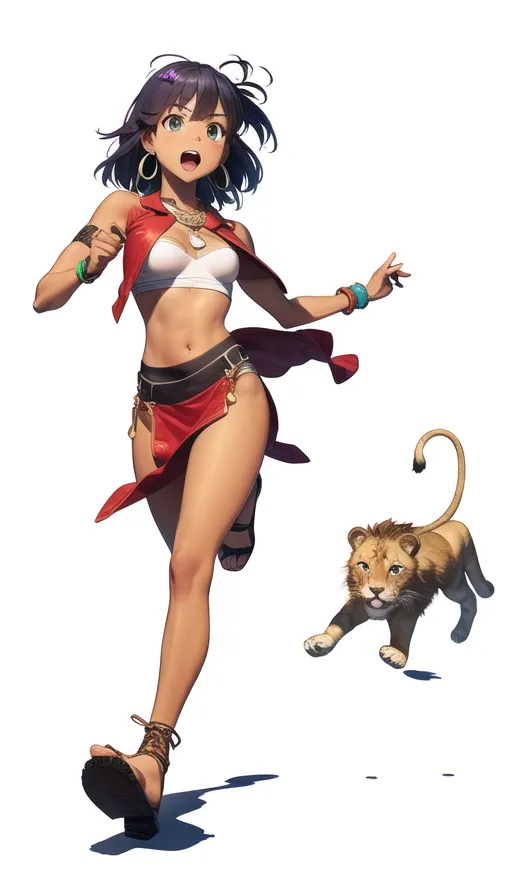 #majinai {{nadia_la_arwall}} #fushigi_no_umi_no_nadia #1girl #solo #light #dark #skin {{dark #indigo #hair #bob_cut #black_eyes #purple #hair #neck_ring #necklace #red #jacket #red #pelvic_curtain #pendant #white #cropped_vest #cross-laced_sandals #hair_ornament #hairclip #hoop_earrings #red #loincloth #open #mouth #Yoshiyuki_Sadamoto #He #wears #a #diamond-shaped #blue #gemstone #around #his #neck #lookup #baby #lion #running #100-layer #masterpiece #highest #best #amazing #great #detail #stylish #illustration {{{{{realistic}}}}} {{masterpiece}} #perfect #anatomy #intricate #highly_detailed {{{3D}}} #baby #lion
