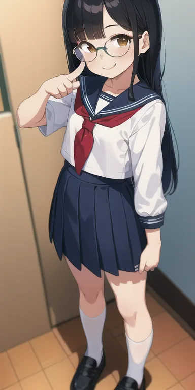 #majinai #masterpiece #best #quality #detailed #1girl #long #hair #black #hair #glasses #delicate #beautiful #face #brown #eyes #flat #chest #serafuku #collared #shirt #white #shirt #BREAK #dark #blue #skirt #black #footwear #look #at #viewer #at_school #standing #young #full #body #smile #finger