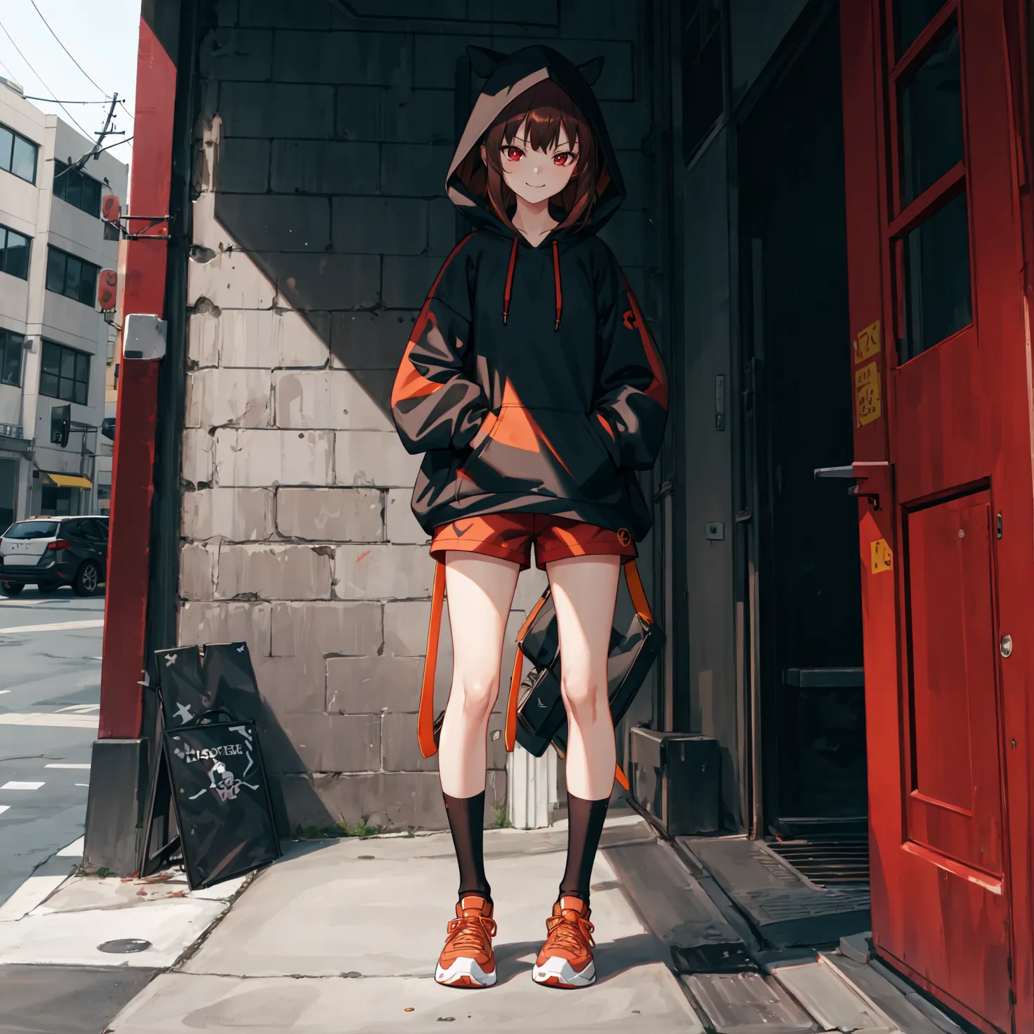 #majinai #best_quality #masterpiece #ultra_detailed #highres #production #art #1girl #megumin #red #eyes #solo #shorts #black #shorts #shoes #hoodie #hood #contemporary #socks #looking #at #viewer #sneakers #v #over #eye #red #socks #standing #short #hair #with #long #locks #alternate #costume #casual #full #body #brown #hair #long #sleeves #v #bangs #shadow #black #footwear #closed #mouth #tiles #smile #yellow #hoodie #hood #down #sidelocks #sleeves #past #wrists #drawstring #sweater #clothes #writing #orange #hoodie