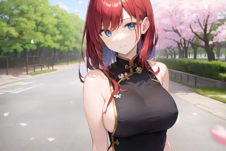 #majinai #masterpiece #best #quality #solo #split-color_hair #balck #and #red_hair #1girl #Mid_hair #realistic #beautiful #detailed #aquagradient #eyes #china #dress #upper #body #cinematic #angle #side #lifting #Looking #at #the #camera #sideboob #Convexity #the #street #where #the #cherry #blossoms #fall