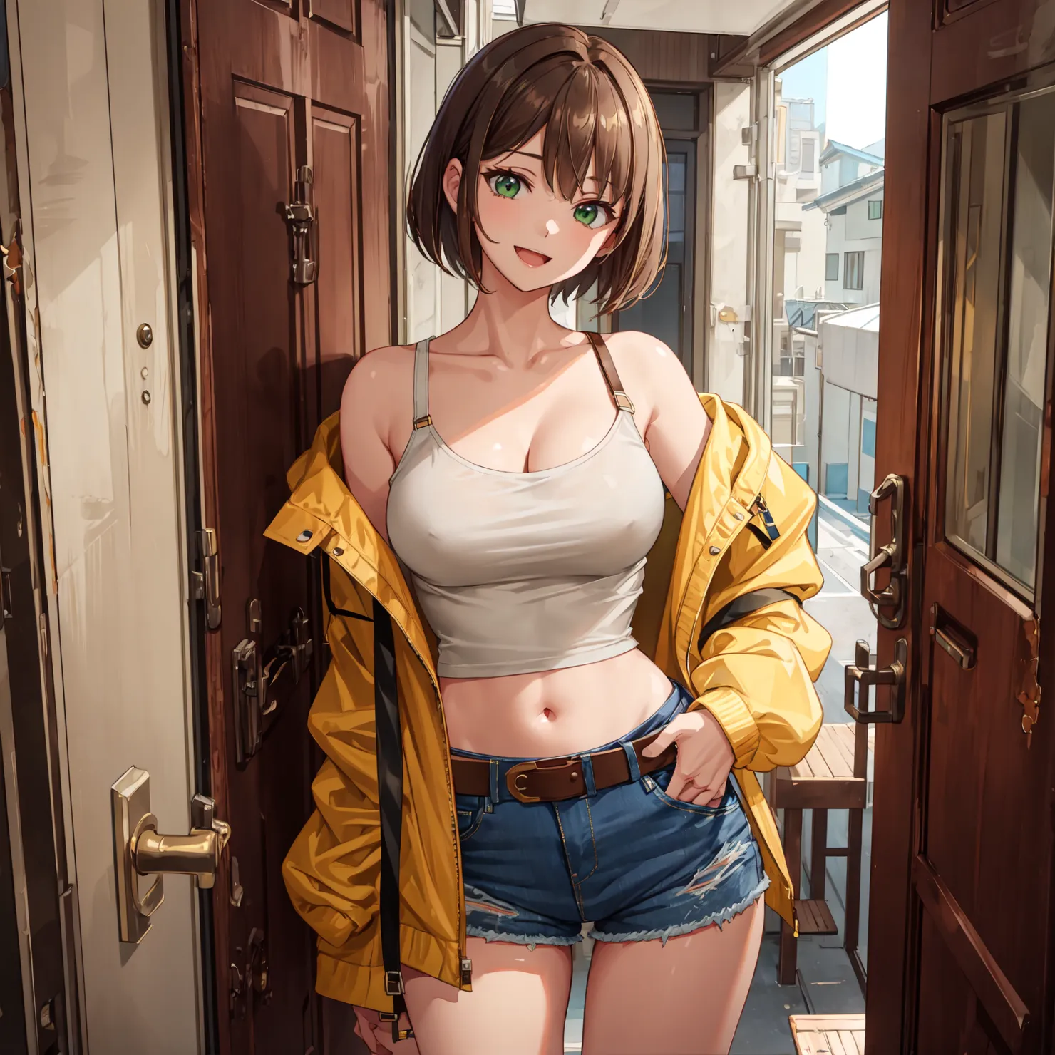 #majinai #best_quality #masterpiece #ultra_detailed #highres #production #art #1girl #shorts #solo #short #hair #denim #brown #hair #open #mouth #breasts #jacket #indoors #denim #shorts #short #shorts #looking #at #viewer #smile #shirt #belt #hand #on #hip #green #eyes #collarbone #white #shirt #medium #breasts #leaning #forward :d #yellow #jacket #door #open #clothes #cutoffs #bangs #hood #open #jacket #cleavage #long #sleeves