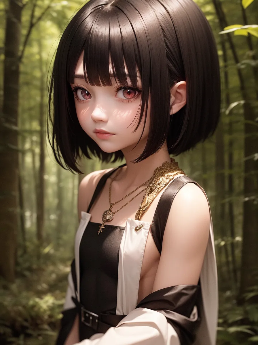 #majinai #girl #red #eyes #messy #hair #short #black #hair #witch #forest #old #cottage #black #dress #portrait #upper #body #runes #necklace #detailed #eyes