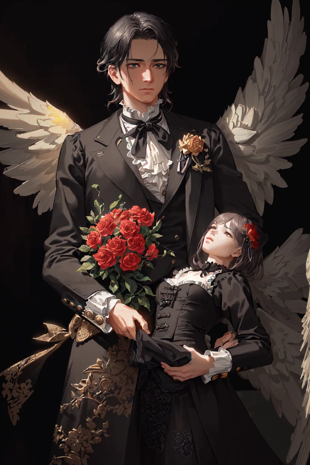 #majinai #extremely #detailed #CG #unity #8k #wallpaper #masterpiece #8k #resolution #hyper_detailed #best_quality #realistic #ultra-detailed #best_illumination #best_lighting #ultra-HD #cryengine #dynamic #camera #angle #Depth #of #field #bloom #Soft_Lighting #an #extremely #delicate #and #beautiful #Illustration #smooth #gradient #lighting #highres #sharp #focus #pixiv #masterpiece #intricate_details #Full #color #Highly #detailed #semi #realistic #wide_shot #landscape_view #midriff #great #composition #a #man #in #a #suit #is #holding #a #woman #close #with #angel #wings #in #a #Victorian #manor #Victorian_aesthetic #crimson #flowers #floating #complicated #background #depth #of #field #sidelighting #cinematic_lighting #horror #dark_fantasy #Bloodborne #illustration #4k #unity #High #contrast #best_illumination #hyper #intricate #details #ultra-detailed #extremely #detailed #CG #8k #beautiful #detailed #glow #Artstation #by #sui #ishida #by #Wenjun #Lin #by #stefan #morrell #a #storybook #illustration #by #Yuumei #semi-realistic #realism #epic #elegant