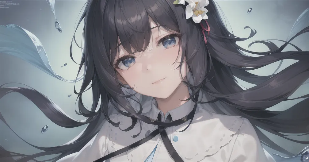 #majinai {masterpiece} #illustration #beautiful #detailed #colourful #finely #detailed #dramatic #light #intricate #details #extremely #best #beautiful #view #eyeball #hair #close #1girl #eflective #hair #particle #emotionless #standing #beautiful #face #light #black #hair #fluffy #medium-short #hair #bangs #1_slim_white_ribbon #on #left #hair #aqua #eyes {Round #eyes #rounded #Eyelids #Brilliant #smile #collared #shirt #blue #and #black #Military #highschool #dress #Fuller #face #looking #at #viewer
