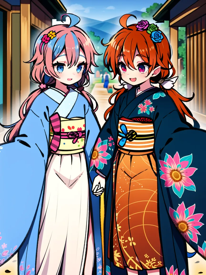 #majinai #long #hair #smile #short #hair #open #mouth #bangs #blue #eyes #multiple #girls #skirt #hair #ornament #red #eyes #long #sleeves #2girls #twintails #blue #hair #flower #ahoge #outdoors #frills #japanese #clothes #barefoot #hair #flower #wide #sleeves #on #back #kimono #orange #hair #looking #at #another #sash #holding #hands #low #twintails #obi #floral #print #frilled #skirt #blue #kimono