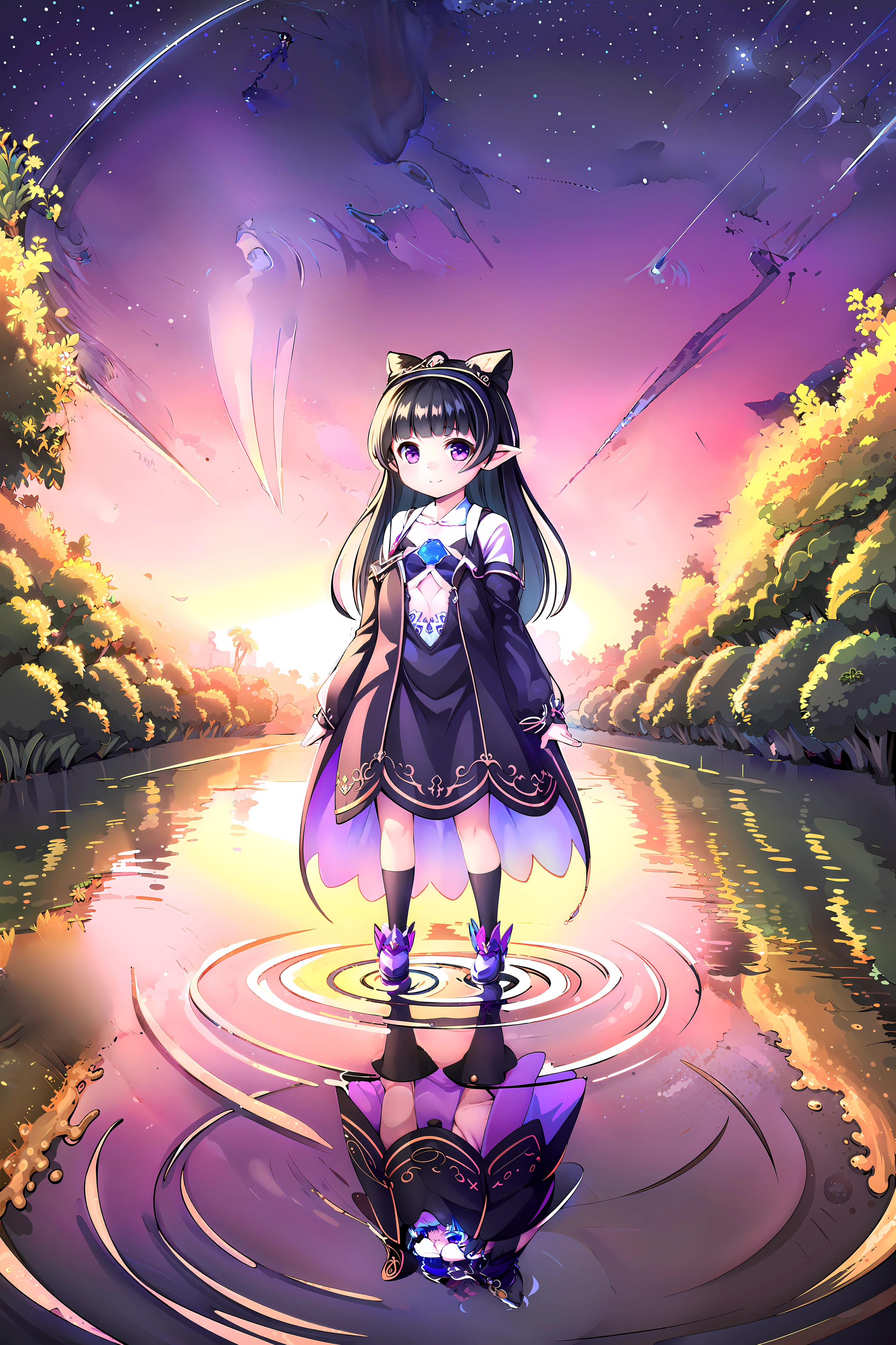 #majinai #elf #ears #1girl #solo #8yo #flat_chest #short #stature #very #small #girl #long #black #hair #long #bobbed #head #blunt #bangs #purple #eyes #best #quality #ultra-detailed #illustration #full #body #daytime #panties #and #cameltoe #reflected #in #puddle