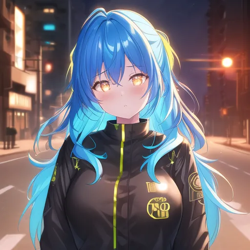 #majinai #1girl #golden_hour #neon #perfect #lighting #extremely #detailed #CG #8k #wallpaper #masterpiece #2 #blue #hair #street