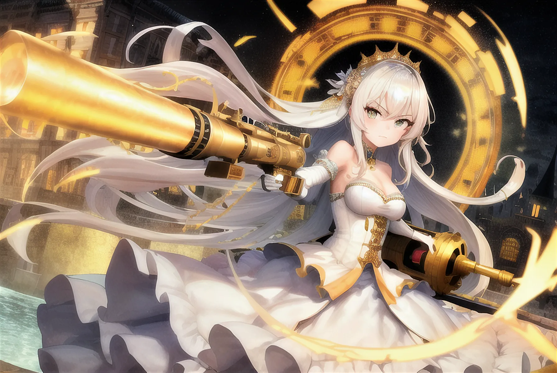 #majinai #masterpiece #best_quality #ultra #high #resolution #ultra-detailed #high #quality #high_resolution #beautiful_detailed_face #beautiful_detailed_eyes #long_shot #dynamic #angle #1girl #wedding #dress #electric #shock #wave #long #hair #gold #shyny #hair #off #shoulder #angry #standing #on #cobble #stone #magic #circle #detailed #weapon #holding #fighting #stance #holding #bazooka #gun #aiming #at #viewer #huge #castle