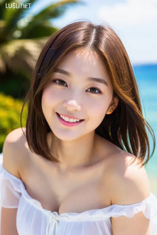 #majinai #masterpiece #best #quality #ultra #high #res #photo #realistic #1girl #full #body #white #blouses #dark #blown #hair #bob #hair #lustrous #skin #seductive #smile #cute #20 #years #old #looking #at #viewer #detailed #background #intricate #background #sea #ocean #reguler #breasts #cosplay