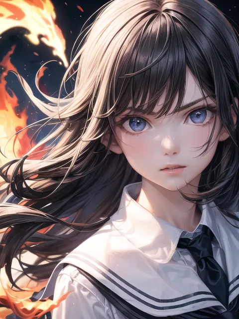 #majinai #masterpiece #best #quality #clear #face #perfect #anatomy #realistic #face #realistic #1girl #female #child #solo #focus #medium #chest #photoreal #detailed #eyes #detailed #face #school #uniform #loose #wearing #background #flame #big #fire #fire #storm #glowing #red #circle #dark #darkness #night #midnight #hime #cut #fair #hair #high #angle #cowboy #shot #looking #at #viewer #windy #angry #dramatic #shadow #depth #of #field