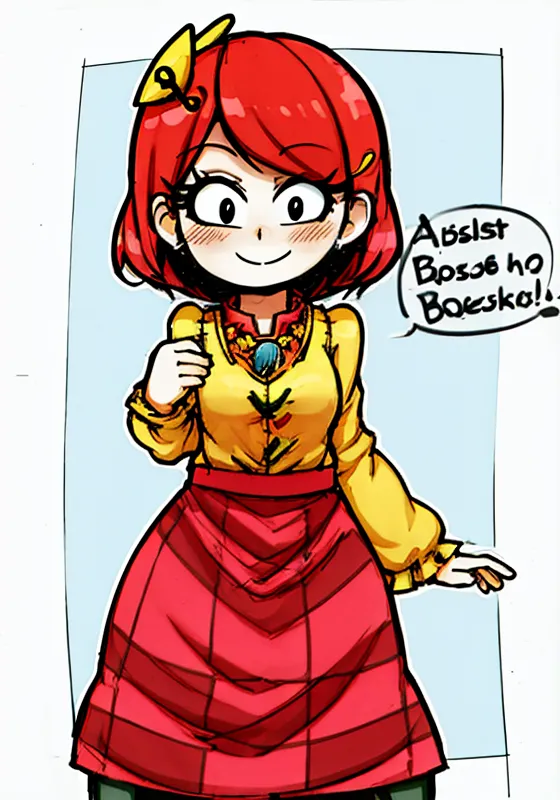 #majinai #touhou_project #fuantei #motoori_kosuzu #1girl #apron #bell #blush #book #boots #checkered #checkered_clothes #checkered_skirt #clothing #female #footwear #hair_ornament #long_sleeves #red_eyes #red_hair #short_hair #skirt #smile #solo #text_on_clothes #useless_tags