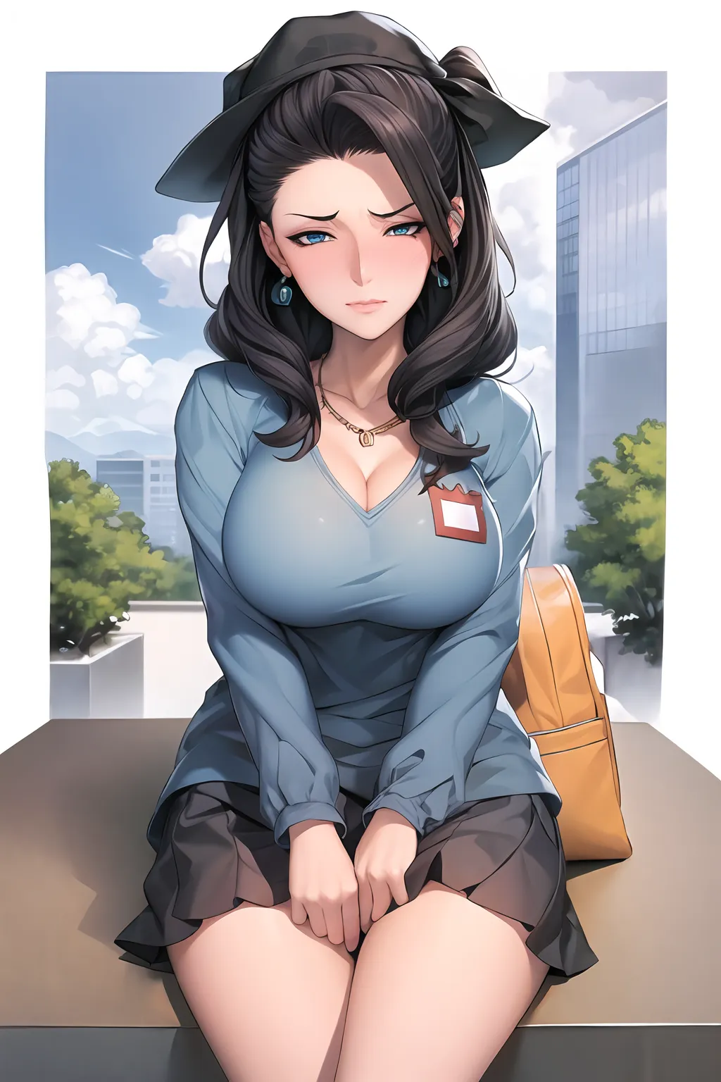 #majinai #best #quality #color #illustration #1girl #solo #cowboy #shot #jwewlry #earrings #and #necklace #thick #makeup #eyeshadow #long #high #pony-tail #large #breasts #cleavage #BREAK #sitting #on #desk #at #office #cityscape #at #outside #window #full #face #blush #seductive #intricate #decolative #eyelashes #eyeliner #odanon #kindergarten_uniform #yellow_hat #yellow_bag #black_skirt