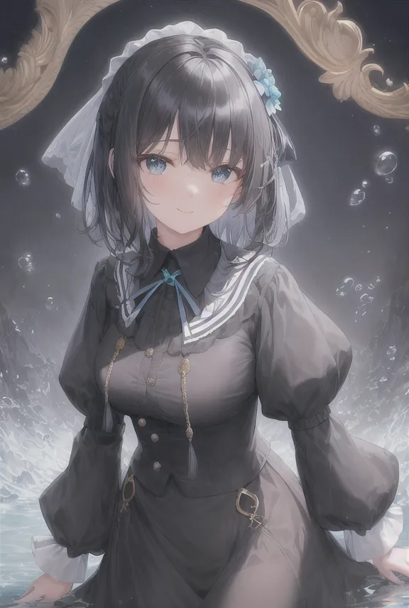 #majinai {masterpiece} #illustration #beautiful #detailed #colourful #finely #detailed #dramatic #light #intricate #details #extremely #best #beautiful #view #eyeball #hair #close #1girl #eflective #hair #particle #emotionless #standing #beautiful #face #light #black #hair #fluffy #medium-short #hair #bangs #1_slim_white_ribbon #on #left #hair #aqua #eyes {Round #eyes #rounded #Eyelids #Brilliant #smile #collared #shirt #blue #and #black #Military #highschool #dress #Fuller #face #looking #at #viewer