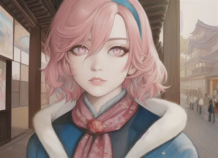 #majinai #highres #portrait #solo #loli #aged #down #flat #chest #faux #traditional #media #blue #dress #pink #skirt #floral #print #blue #open #coat #fur-trimmed #sleeves #red #striped #scarf #pink #gloves #fur-trimmed #hairband #heart #of #string #third #eye #pink #hair #shiny #hair #wavy #hair #short #hair #messy #hair #bangs #hair #between #eyes #pink #eyes #glowing #eyes #black #eyeliner #eyelashes #outdoors #east #asian #architecture #street #night #night #sky #starry #sky #lens #flare #colored #pencil #medium #wide #shot #hito_komoru #Henri #de #Toulouse-Lautrec #Raymond #Leech #Antonio #Cavallucci #Luke #Fildes #soft #colourful #finely #detailed #painting #oil #painting #medium #solo #focus #greyscale #detailed #background #detailed #face #detailed #eyes #realistic #photo #traditional #media #portrait #painting #sketch #oil #painting #classic #art #famous #artist #historical #art #historical #figure #historical #portrait #classical #art #classical #portrait #classical #painting