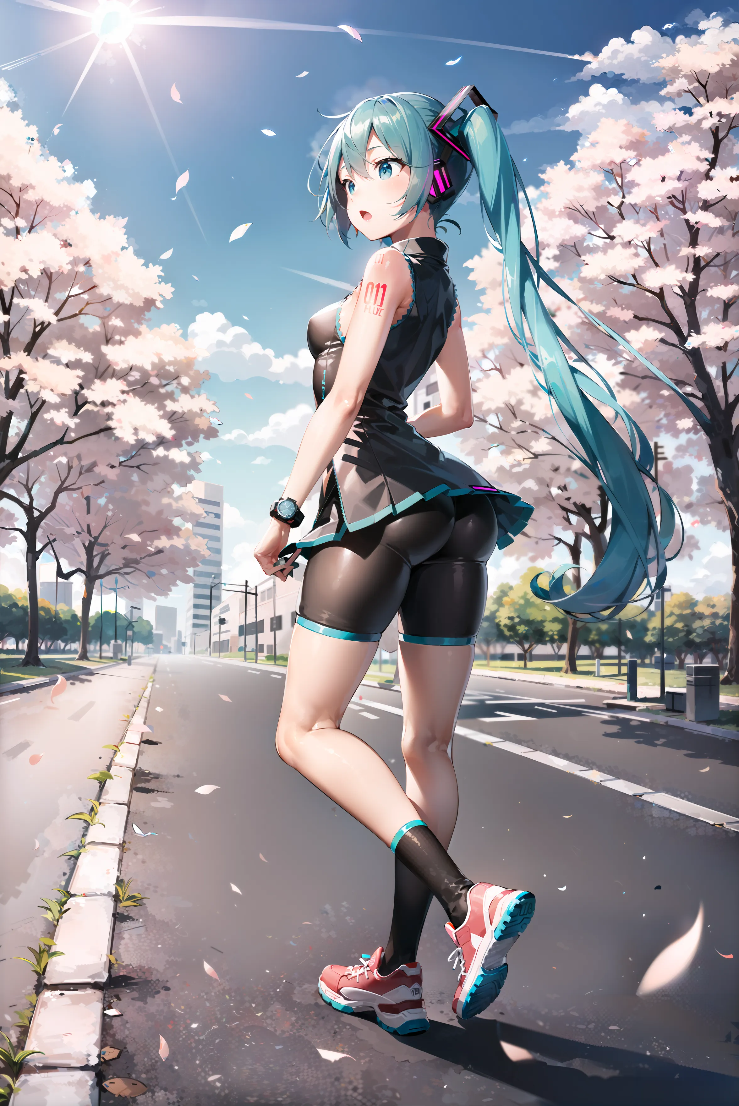 #majinai #best #quality #ultra #detailed #shiny #skin #sharp #focus #daytime #cloud #sunlight #view #from #side #full #body #no-human #running #on #street #hatsune #miku #beautiful #face #beautiful #detailed #eyes #dynamic #shiny #hair :o #small #breasts #sports #shoes #sports #pants #sash #watch #socks #looking #afar #clothes #without #luster #BREAK #stores #buildings #cars #bicycle #motor #bike #power #line #manholes #wind #course #marker #signboard #road #sign