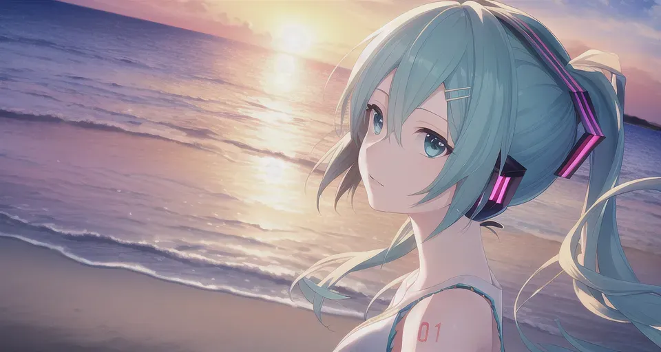 #majinai #masterpiece #best_quality #miku #seaside #sunrise #sky #sea #solo #hairclip #in #summer #official #art #intense #angle #dramatic #angle #detailed #clothes #detailed #face #detailed #eyes #detailed #background #detailed #skin