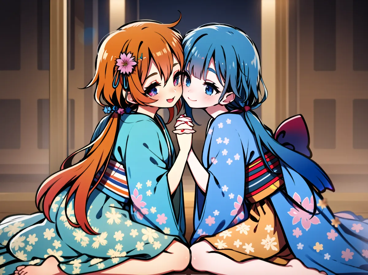 #majinai #2girrls #long #hair #smile #short #hair #cheek-to-cheek #kiss #yuri #bangs #blue #eyes #multiple #girls #skirt #hair #ornament #red #eyes #long #sleeves #twintails #blue #hair #flower #ahoge #outdoors #Plum #blossoms #frills #japanese #clothes #barefoot #hair #flower #wide #sleeves #on #back #kimono #orange #hair #looking #at #another #sash #holding #hands #low #twintails #obi #floral #print #frilled #skirt #blue #kimono