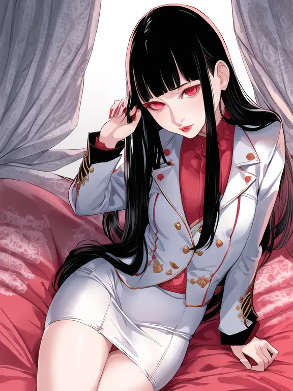 #majinai #thorough #and #precise #Accurate #describe #shapes #beautiful #detailed #illustration #girl #of #futon #tight #skirt #white #tight #skirt #jacket #white #jacket #mature #female #lips #red #lips #faint #lips [small #pearl #earling [small #pearl #neckres #hair #black #hair #shoulder-length #flizzy #hair #smirk #horror #realistic #eye