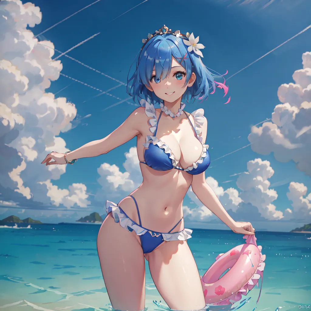 #majinai #best_quality #masterpiece #ultra_detailed #highres #production #art #1girl #solo #swimsuit #blue #hair #blue #eyes #bikini #chibi #hair #over #one #eye #breasts #short #hair #beach #hair #ornament #innertube #blue #bikini #smile #x #hair #ornament #large #breasts #cleavage #outdoors #looking #at #viewer #navel #ocean #day #full #body #standing #frills #sky #pink #ribbon #frilled #bikini
