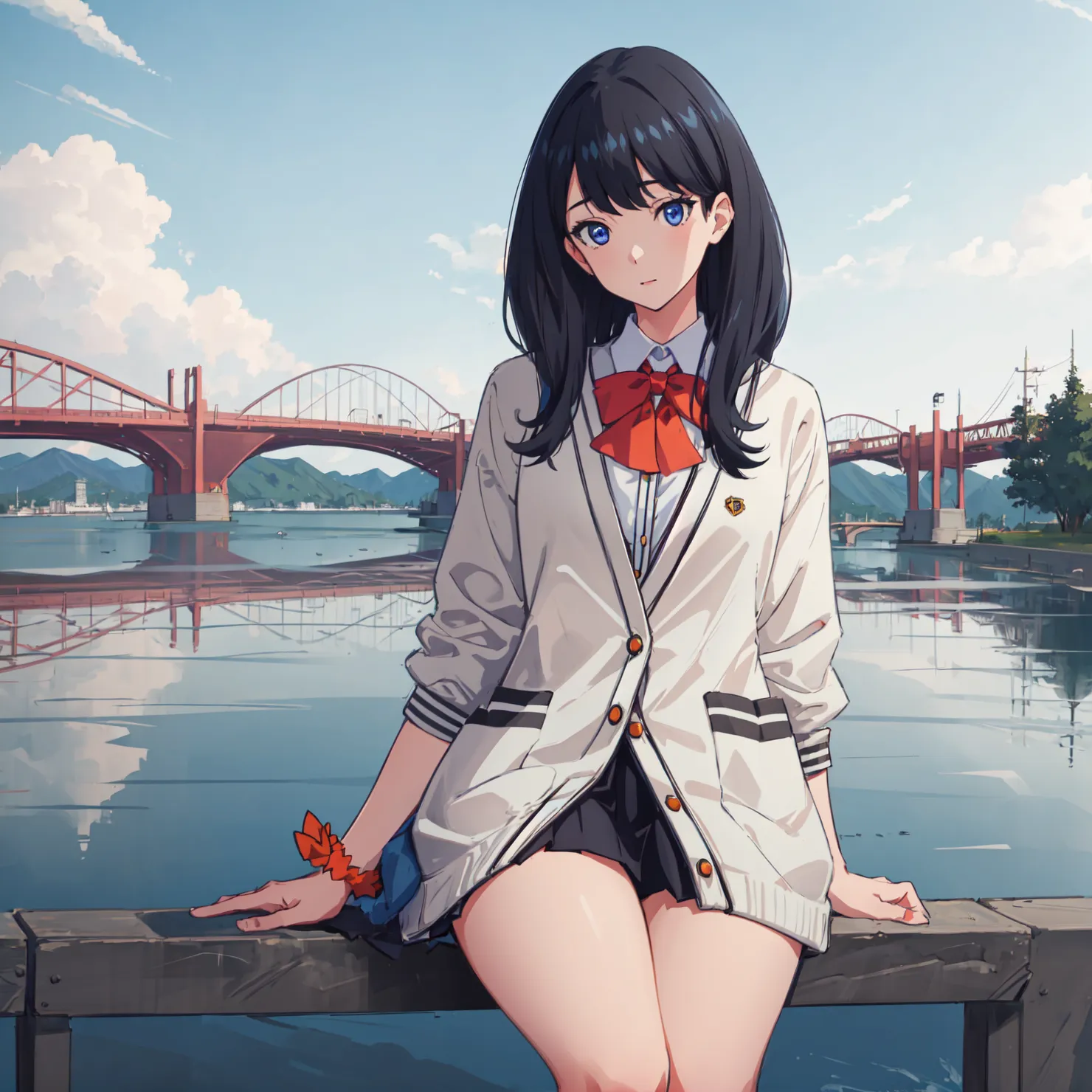 #majinai #best_quality #masterpiece #ultra_detailed #highres #production #art #1girl #takarada #rikka #black #hair #long #hair #blue #eyes #white #cardigan #microskirt #red #bowtie #school #uniform #orange #wrist #scrunchie #sitting #bridge #river #detailed #sky #cowboy #shot