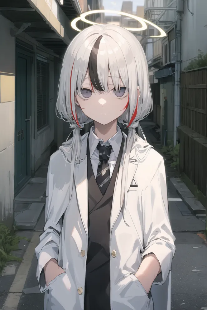 #majinai #1girl #streaked #black #hair #white #hair #low #twintails #Piece #Suit #tie #white_cape #silver_eyes #empty #eyes #halo #expressionless #clear #face #bloody #on #face #outdoors #city #alleyway #shade