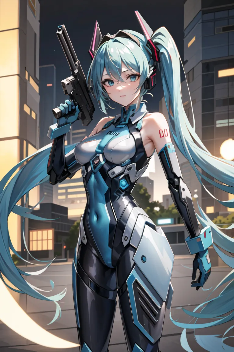 #majinai #masterpiece #best #quality #extremely #detailed #face #perfect #lighting #hatsune #miku #cyberpunk #mecha_musume #headgear #mechanical_arms #bodysuit #holding #gun #gun #night #building