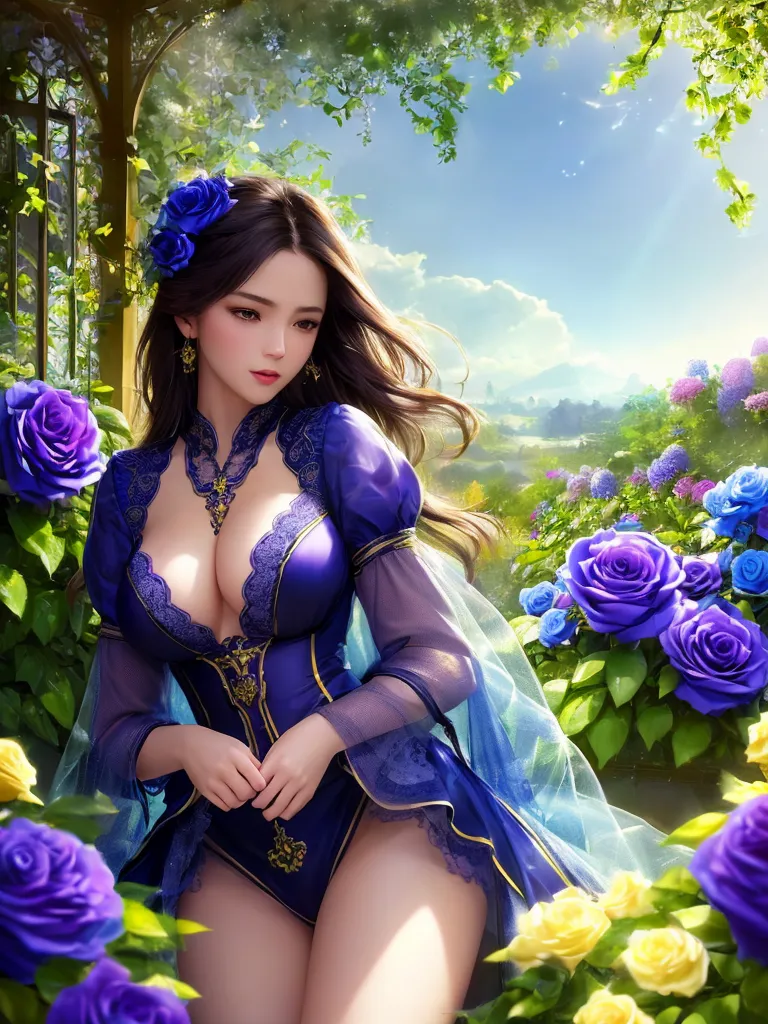 #majinai #masterpiece #atmospheric #High #resolution #1girl #perfect #face #smooth #skin #beautiful #face #light #joyful #luxurious #cinematic #Film #light #Hyper #detailed #Hyper #realistic #Vibrant #High #contrast #background #is #garden #in #blue #and #violet #yellow #roses