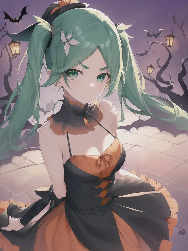 #majinai #masterpiece #best #quality #ononoki_yotsugi #1girl #aqua_hair #green #eyes #loli #short_twintails #flipped #hair #thick_eyebrows #serious #monogatari #series #masterpiece #watanabe_akio #black #and #yellow #dress #halloween #expressionless #highres #beautiful #detailed #background #straight #hair #beautiful #detailed #eyes #best_quality #short #hair #illustration #ultra-detailed #night #cinematic_lighting #masterpiece_portrait #hat #arrogant_face #looking #at #viewer