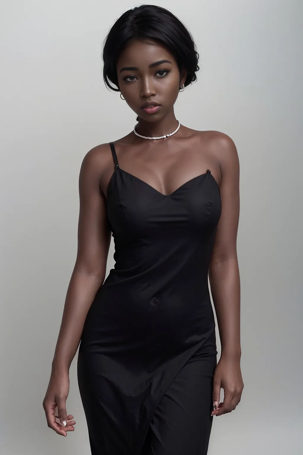 #majinai #masterpiece #best #quality #8k #masterpiece #best #quality #8k #1 #girl #solo #mature #woman #slender #very #dark #skin #shaded #face #simple #calligrahapic #background #standing #cool #face #calm #sharp #eyes #soft #smile #black #hair #sexy #white #chinese #dress #bare #shoulders #hoop #earings #intricate #designed #short #twintails