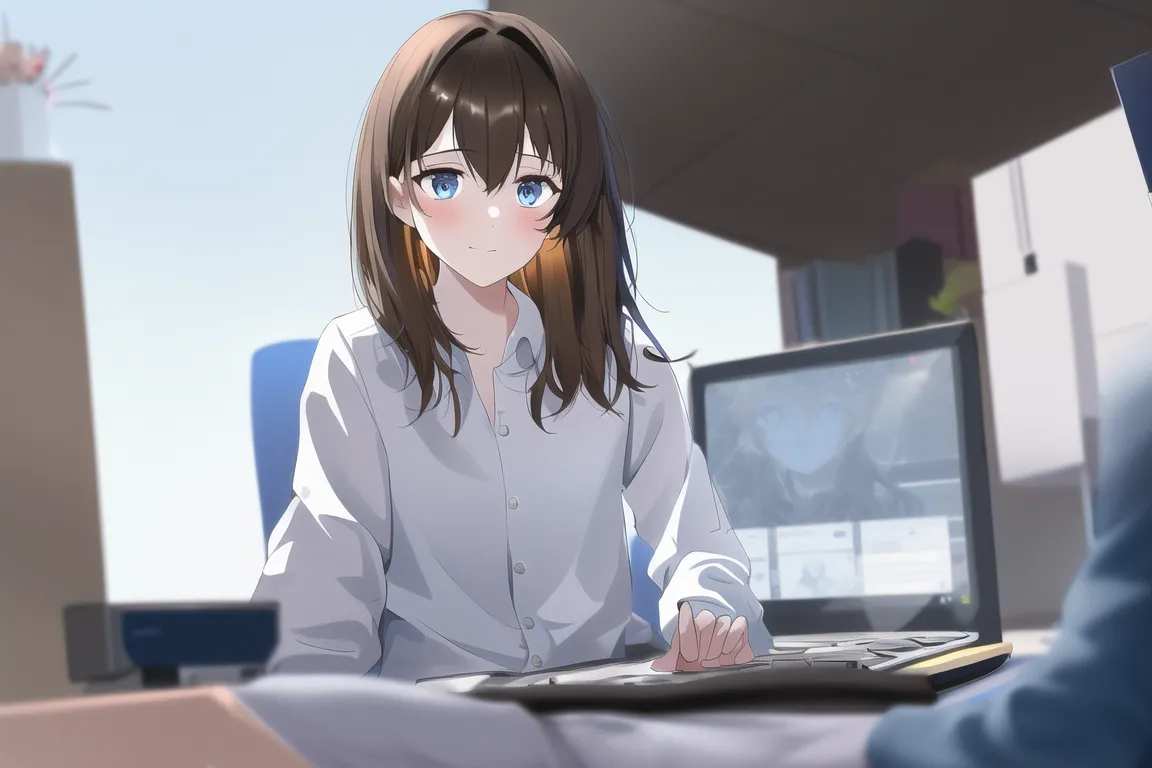 #majinai #A #young #girl #with #short #brown #hair #and #bright #blue #eyes #wearing #a #white #shirt #and #jeans #She #is #a #student #who #loves #to #learn #about #AI #and #robotics #and #she #often #uses #her #AI-enabled #laptop #to #research #and #develop #her #own #projects