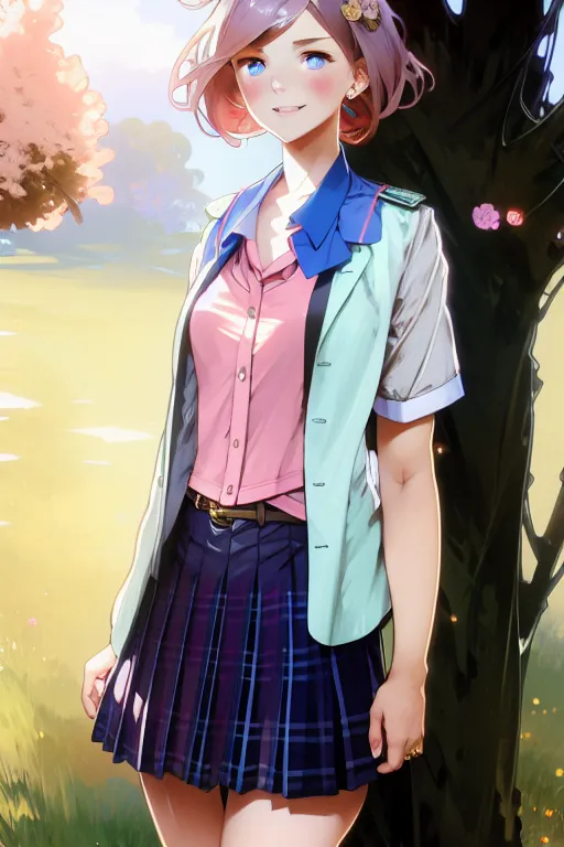 #majinai #schoolgirl #school #uniform #cleavage #open_shirt #short #fluffy #hair #vibrant #colors #modern #style #detailed #face #beautiful #face #by #greg #rutkowski #and #alphonse #mucha #d & #d #character #in #front #of #an #rural #background #digital #painting #concept #art #smooth #sharp #focus #illustration #artstation #hq