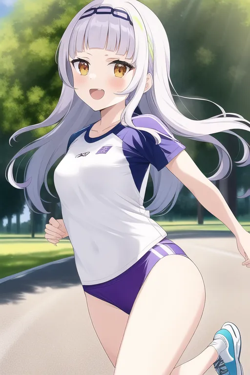 #majinai #masterpiece #best #quality #viewfinder #Illustration #1girl #murasaki #shion #loli #orange #eyes #forehead #blunt #bangs #sidelock #black #hairband #single #right #side #bun {{{{{light #white #purple #hair #blown #hair #long #hair #small #breast {{wearing #sports #wear {{running #in #the #park #dynamic #pose #depth #of #field #concept #art