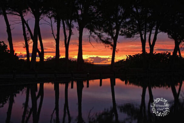 Took this photo of a stand of Austrailian pine trees one evening at sunset here on a Florida Gulf coast beach. An earlier rainstorm had left puddles in its wake and they made for beautiful reflections. The copyright seal will not appear on the product.