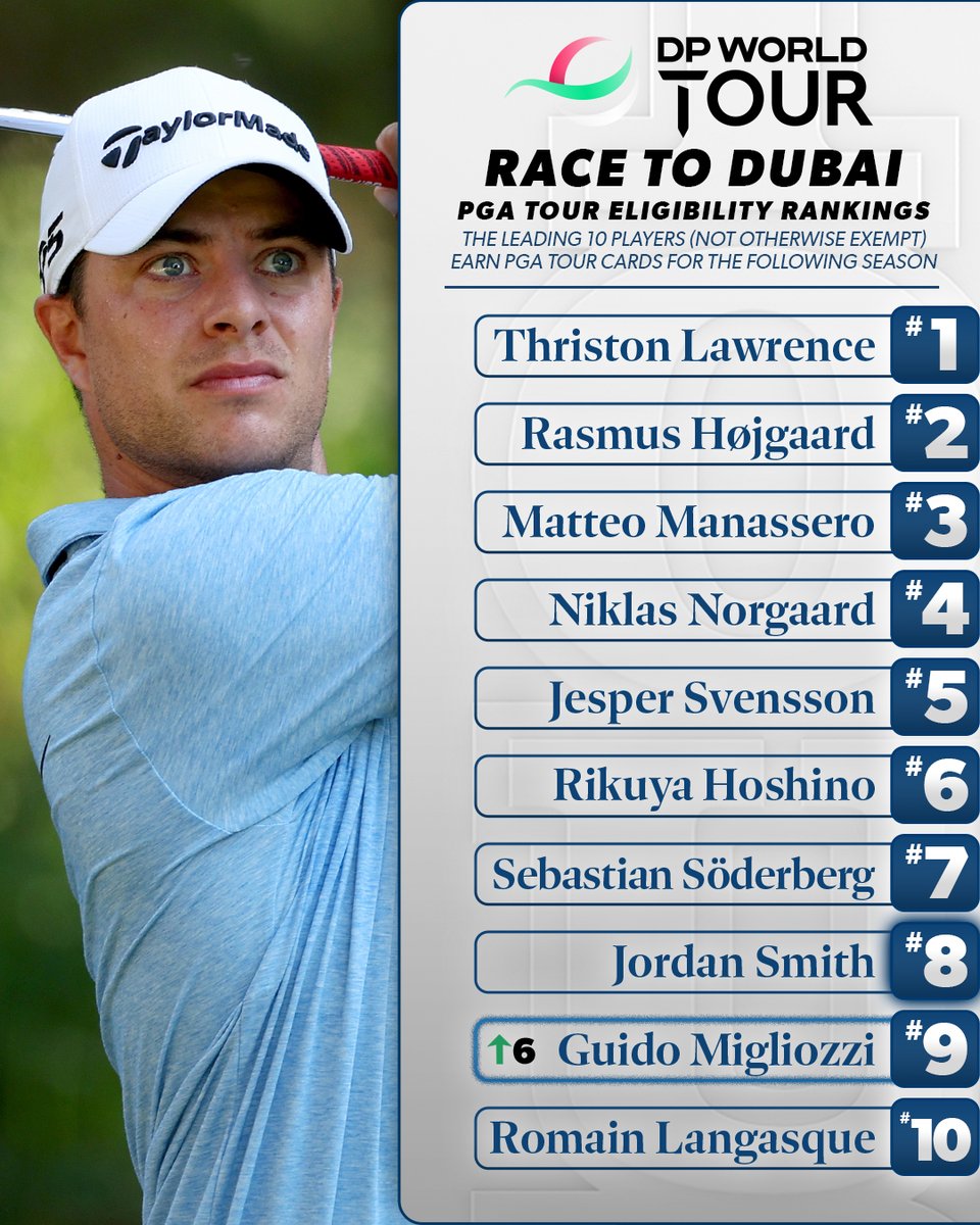With his top-5 finish last week on @DPWorldTour, Guido Migliozzi moves into the ninth spot in the Race to Dubai PGA TOUR Eligibility Rankings.