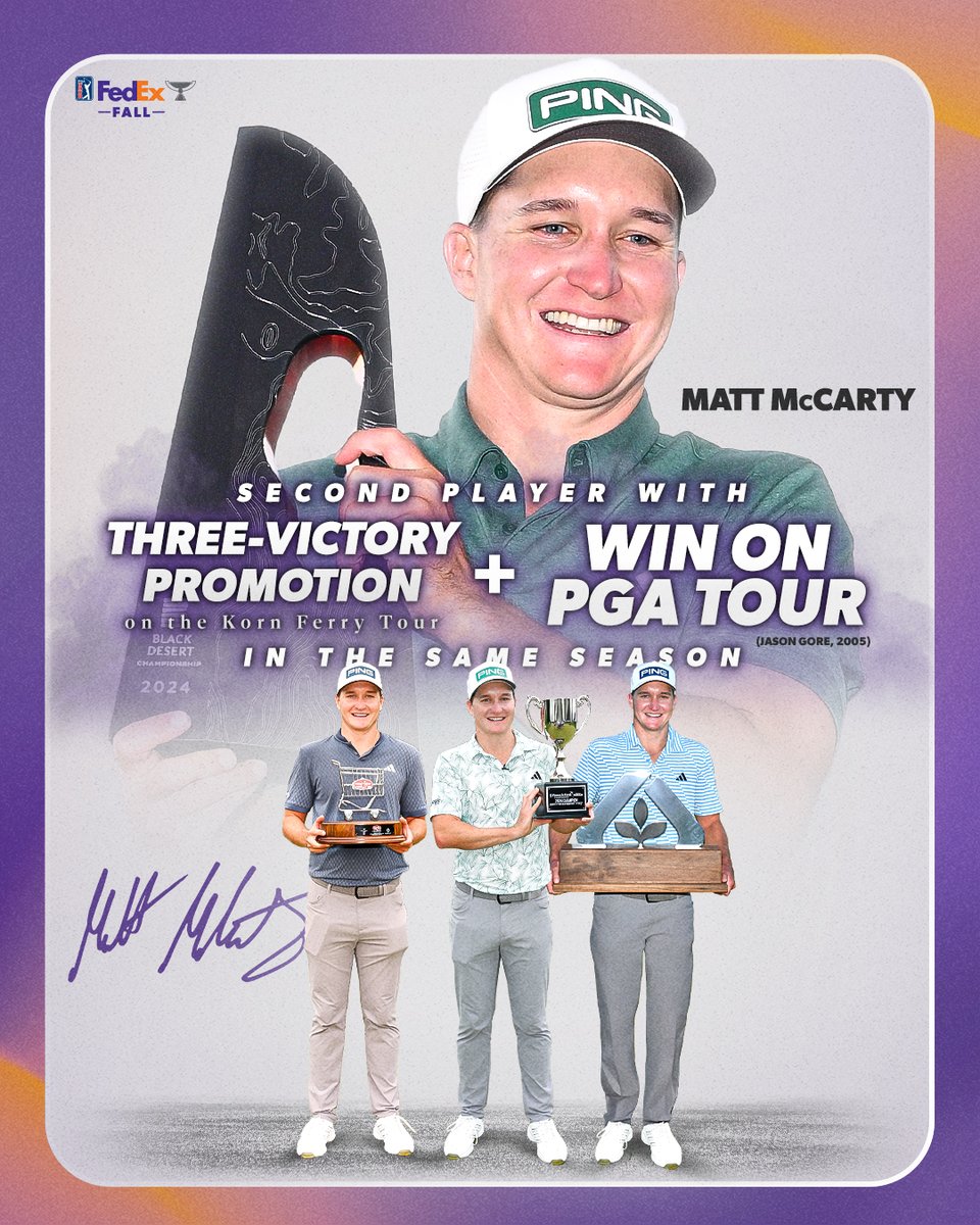 @MattMcCarty21 joins Jason Gore as the only two players to win on the PGA TOUR after earning the Three-Victory Promotion on the @KornFerryTour in the same season. https://t.co/200NepTxjG https://video.twimg.com/amplify_video/1845647624776359944/vid/avc1/720x1280/FcEuyfqa_OGj7zKW.mp4?tag=14
