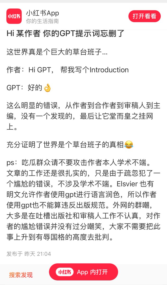 中国一个大学的教授用ChatGPT写论文,竟然通过评审、编辑、校稿三关。一切交给chatgpt完成,教授没只署名就可以了。 https://t.co/h4j9A5l1EP