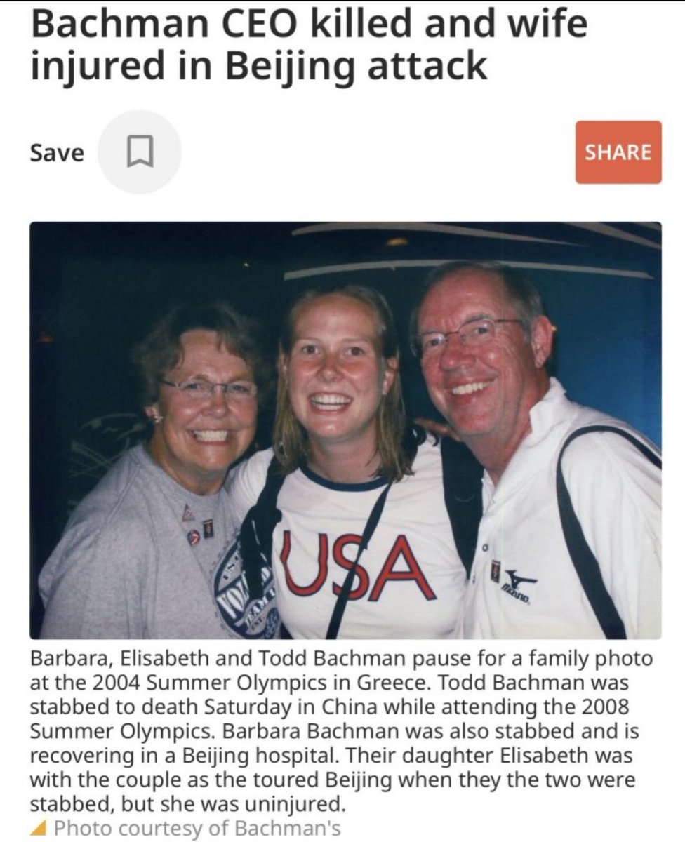 四位美国康乃尔学院教师和一位中国人在吉林被“五捅”后,外交部发言人继续说中国是世界上最安全的国家。先不说中共领导方志敏绑架和杀害美国传教士夫妇,更不谈拳匪义和团杀害多少美国人,还有被迫和红军一起走长征的外国人,就说2008年北京夏季奥运会期间,美国明尼苏达的花园企业老板Todd Bachman在2008年北京奥运会期间在北京的旅游景点被人活活捅死。当时他走在太太的后面,当他遇袭后太太转身和靠近Todd, 随即太太也被捅成具有生命危险的重伤。他们雇的导游也受伤了,幸运的是只有丈夫失去了生命。他们的一个女儿是排球选手,曾经代表美国参加过希腊奥委会。那次他们去北京的原因是因为他们有位女儿是美国排球主教练的妻子。父母本身就有陪同和观赏女儿比赛的习惯,没有想到在中国这个号称世界上最安全的国家丧命。