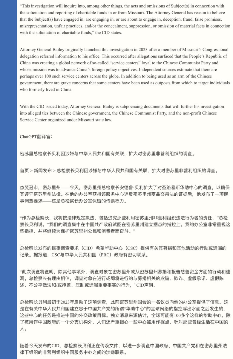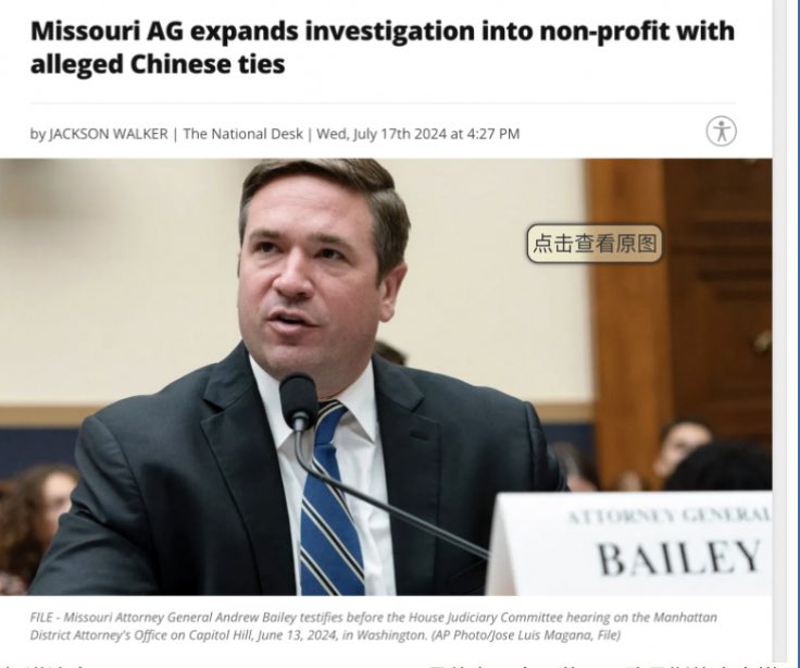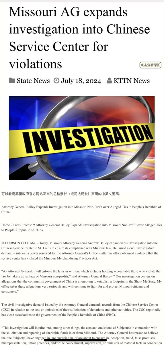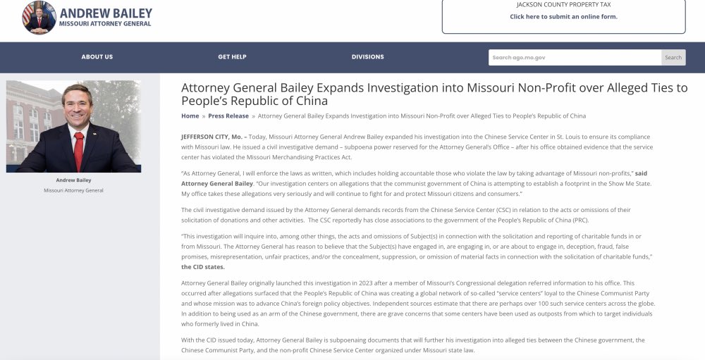 美国开始调查各地作为中共大统战的大外宣的“华人服务中心”。今天美国圣路易斯的多家媒体争相报道,密苏里州的司法局长Andrew Bailey扩大了他们对“Chinese Service Center in St. Louis“与CCP有联系的调查,尤其来自CCP的资金支持。