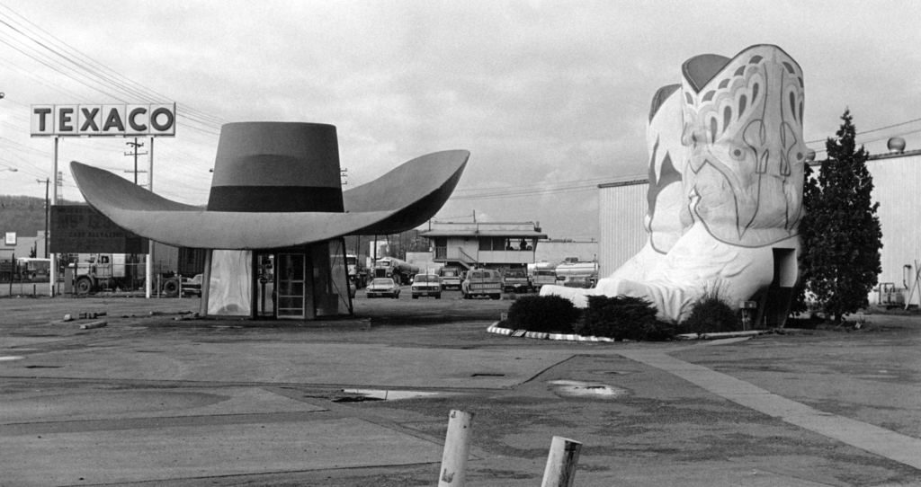 Hat ‘n’ Boots, designed by Lewis Naysmith with permit drawings by Albert Poe. Opened in 1954, Texaco could not save this station from closing around 1988. Received designation as a Seattle Landmark in 2002 and relocated to nearby Oxbow Park. #hatnboots