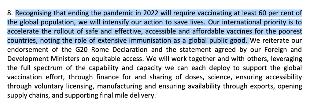 "Recognising that ending the pandemic in 2022 will require vaccinating at least 60 per cent of the global population, we will intensify our action to save lives."