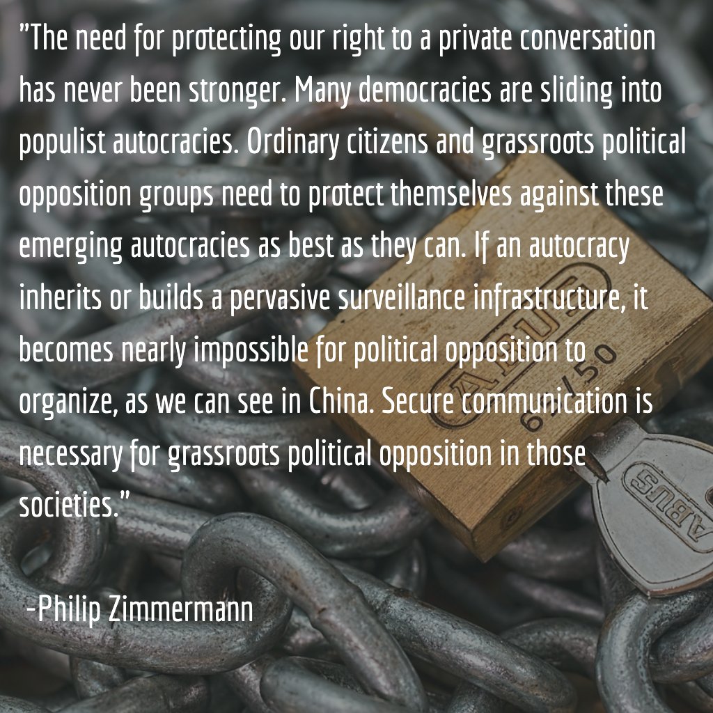 Phil Zimmermann discusses the importance to have the right to secure communications and private conversation for sake of activism -- on this the 30th anniversary of PGP.