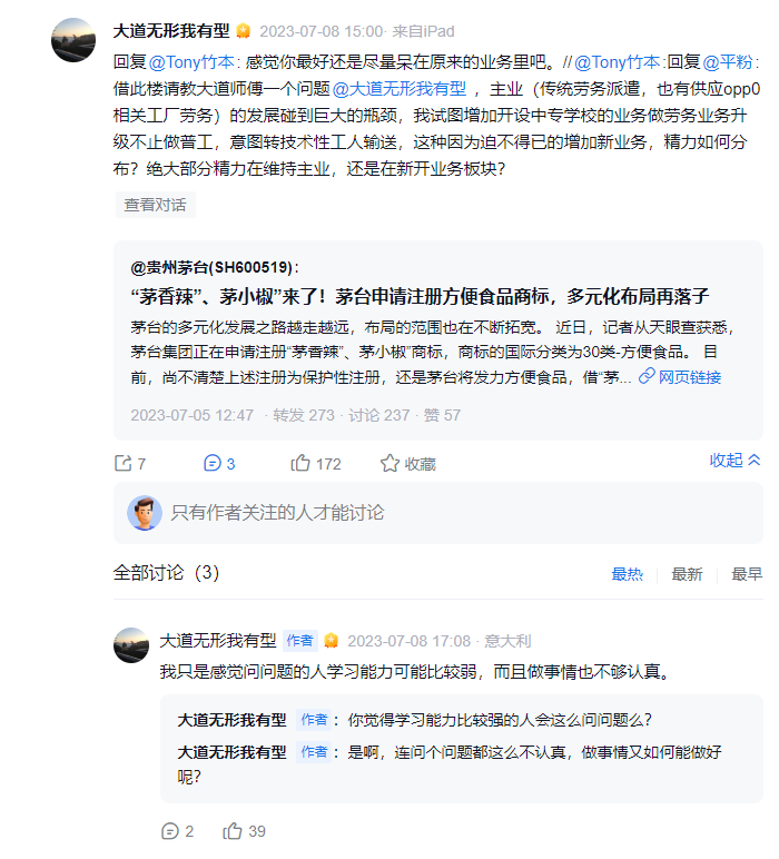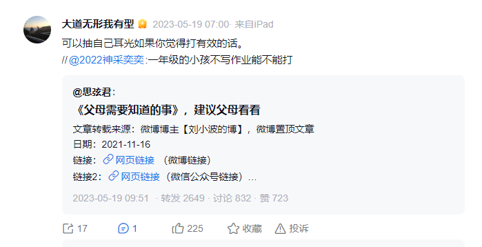段永平经常会对一些用户的亲子问题投稿或者亲子教育的文章进行转发或者点评有些观点还挺有启发或者让人思考的。