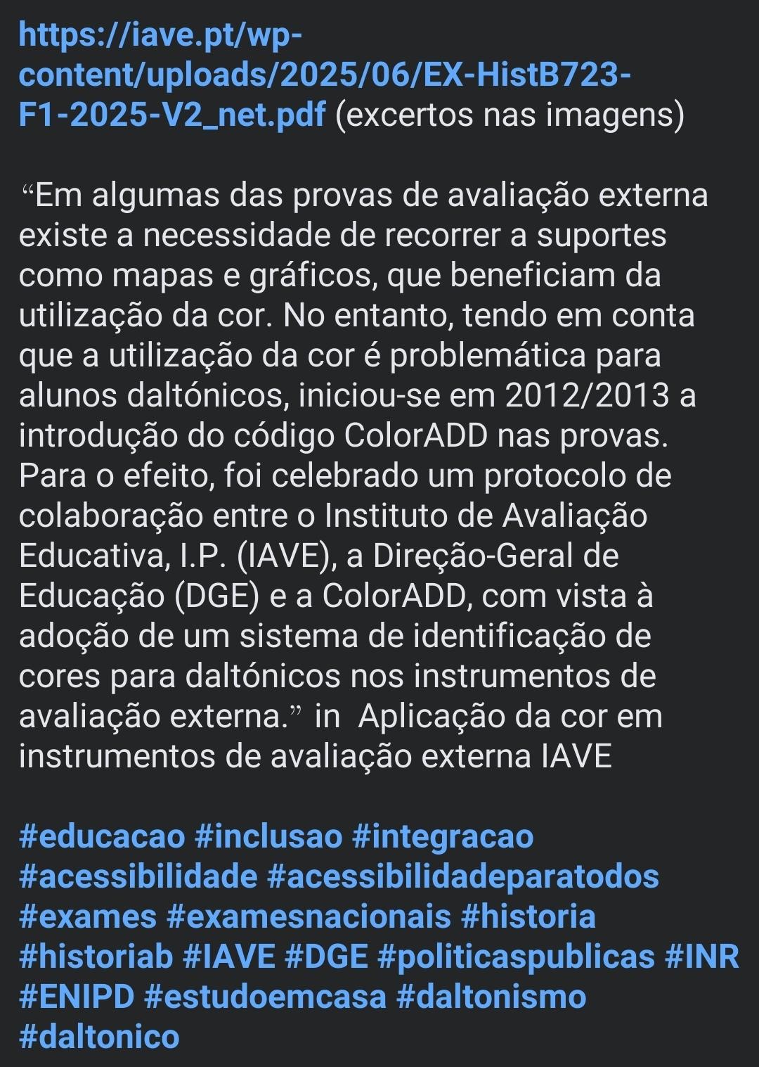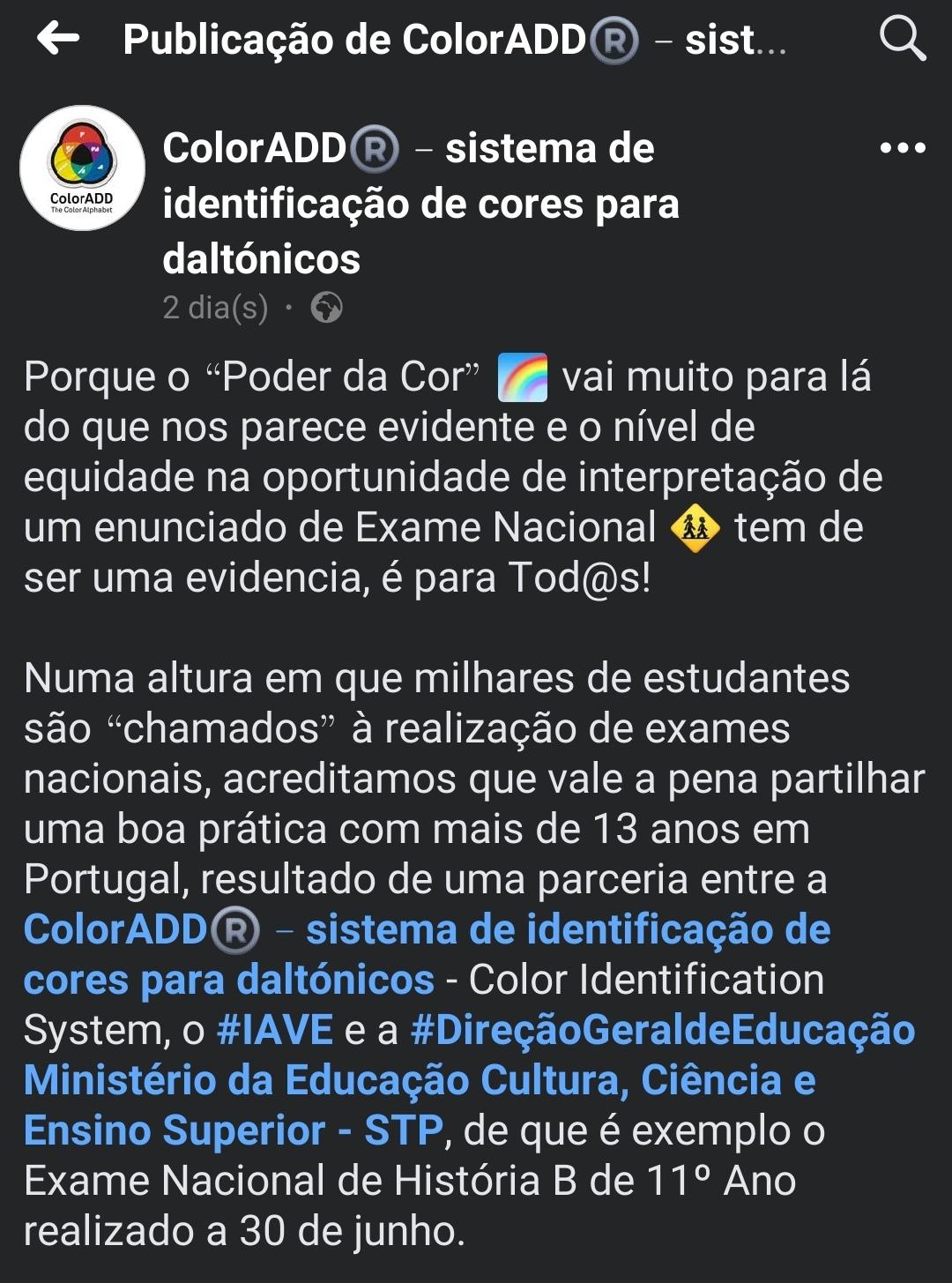 Inclusão... O sistema ColorADD permite que daltónicos distingam as cores na interpretação de um mapa, gráfico, etc.. Colaboram com o IAVE há 13 anos, aparentemente, e apresentam isto como exemplo. Acham que é bom como outros que vi em exame, é pena que a experiência valha pouco 🙂