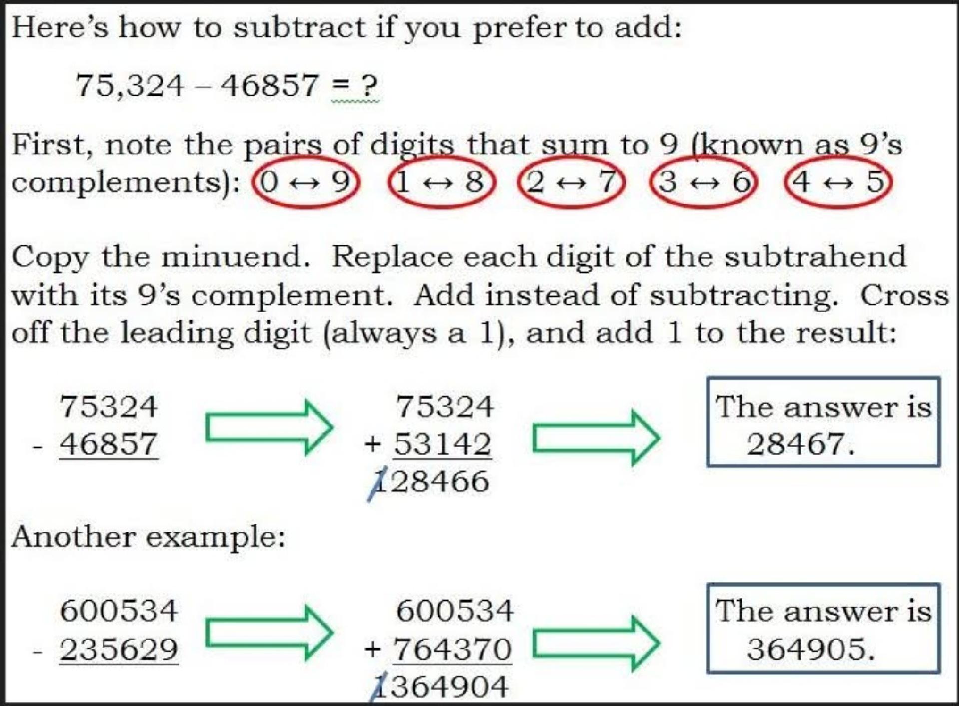 Forma de "trocar" uma subtração por adição, seguir uns "passos" e chegar ao mesmo resultado. 1º exemplo, 75324-46857: